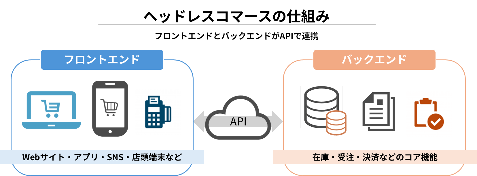 ヘッドレスコマースは、フロントエンド(顧客が見る部分)とバックエンド(受注管理・在庫・決済などのEC基盤)を切り離し、APIで連携させる構造です。