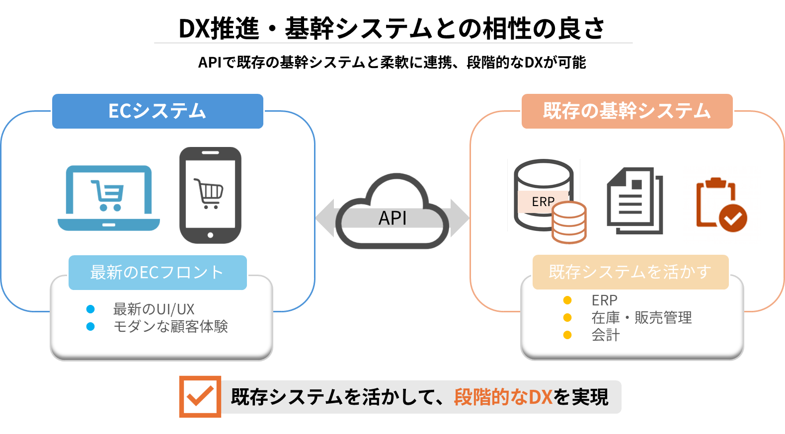 また、ヘッドレスコマースが注目される理由の一つに、企業のDX推進と非常に相性が良い点が挙げられます。多くの企業では、すでにERPや販売管理、在庫管理、会計システムなどの基幹システムが稼働しており、その中には、「ECを新しくしたいが、既存システムをすべて置き換えるのは現実的ではない」という課題を抱えている企業も少なくないのではないでしょうか。