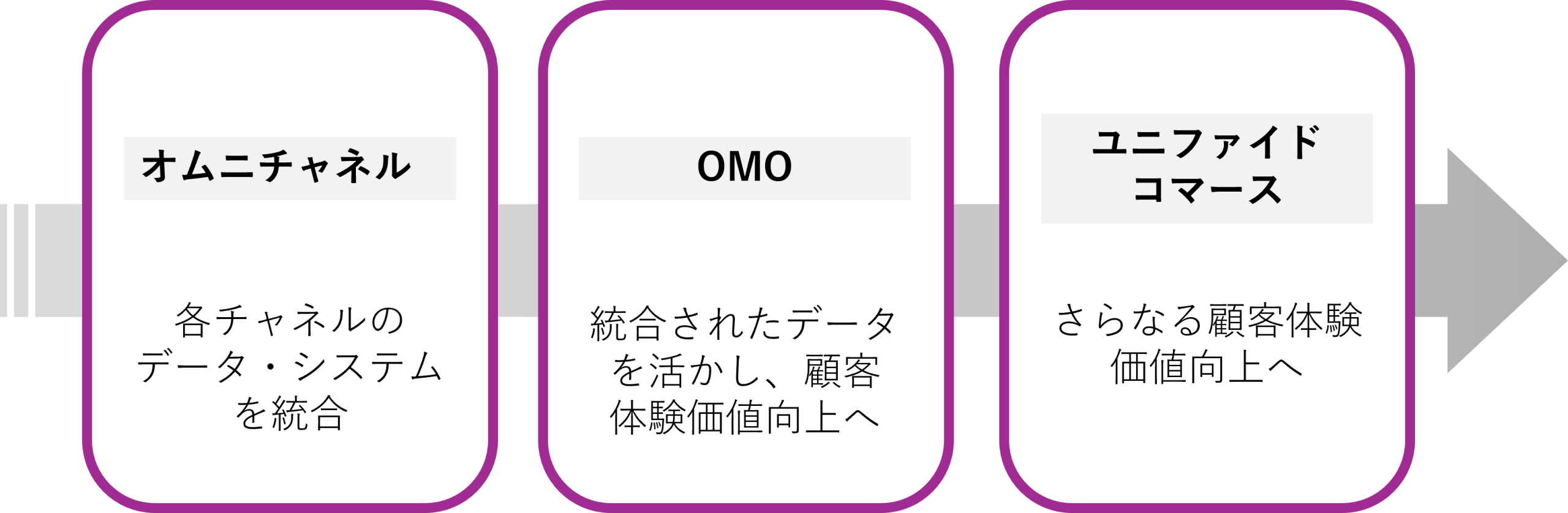 そのためユニファイドコマースは、データやシステムを統合させるオムニチャネル、その統合されたデータを活かして購買体験価値を向上させるOMOの発展型ととらえることができます。