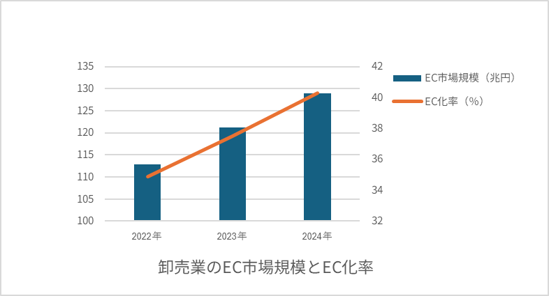 その一方で、卸売業のBtoB EC市場規模は128兆8,684億円(前年比6.3%増)、EC化率は40.3%と着実に成長しています。